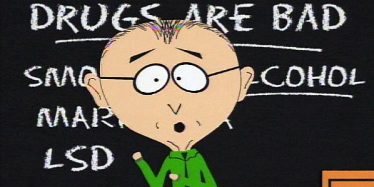 The basis for this problem is children (shifty untrustworthy individuals in my opinion the lot of ’em) who in their early teens begin to be exposed to the possibility of drug use without being in any way suited to actually doing so. Ever see a 14 year old on acid? It’s not pretty. Thus parents often resort to the rather lame but temporarily effective strategy of telling their youth that all drugs are bad, mmm’kay? Which is fine for a couple of years, until the teen discovers the truth.