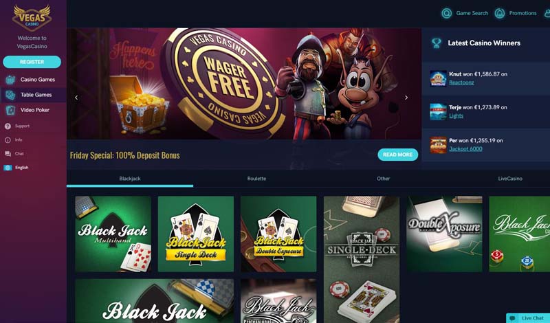 Should you decide to join Vegas Casino and explore what it’s like to be in Las Vegas, you will find a total of 120 of the best online casino games. The software for these are created by the most popular developers such as BetSoft and NetEnt, among others. Guns N’ Roses, Mega Jackpot and Rook’s Revenge are the biggest hits among slot games, but at Vegas Casino, you can surely find whatever type of online slot you are looking for.