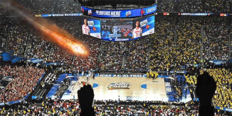 Ever watched Michael Bay’s Armageddon and thought “Wow, what if this really happened”? Well, I don’t think you should worry too much about meteorites, but you still have better chances of your house getting destroyed by a meteorite than filling a perfect March Madness bracket. The surface of the Earth is around 500,000,000 square km. Assuming that the meteorite can hit anywhere, and counting an average house to be 200 square meters long, the chances of it destroying our house exactly are 0,0002 / 500,000,000, which is one to 4,000,000,000,000. Still one of the things more likely than a perfect March Madness bracket!