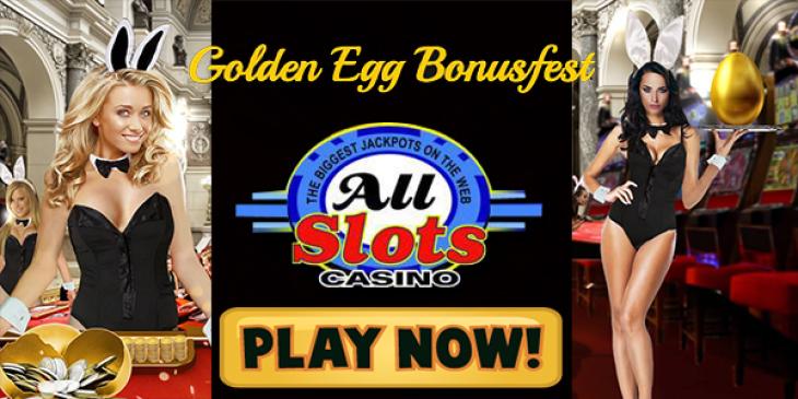 All Slots Casino Easter bunnies are turning Golden Eggs into over $80,000 in bonuses. To join the Bonusfest each week just deposit $20 or more at All Slots Casino. Get 1 egg per day upon playing. Jand just remember, the more eggs you collect, the more you could win each Sunday. If you collect all 7 eggs you are guaranteed abonus!